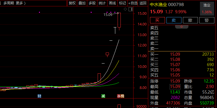11 月 14 日至 11 月 21 日间的六个交易日内,中水渔业股价从最低 8.54 元/股涨至 15.09 元/股,累计涨幅近 77%。