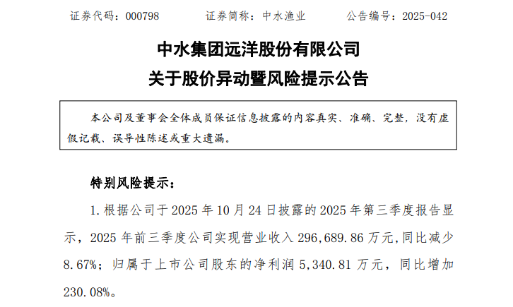 对于近期股价异动,中水渔业提示,根据公司于 2025 年 10 月 24 日披露的 2025 年第三季度报告显示,2025 年前三季度公司实现营业收入 29.67 亿元,同比减少 8.67%;归母净利润 5340.81 万元,同比增加 230.08%。