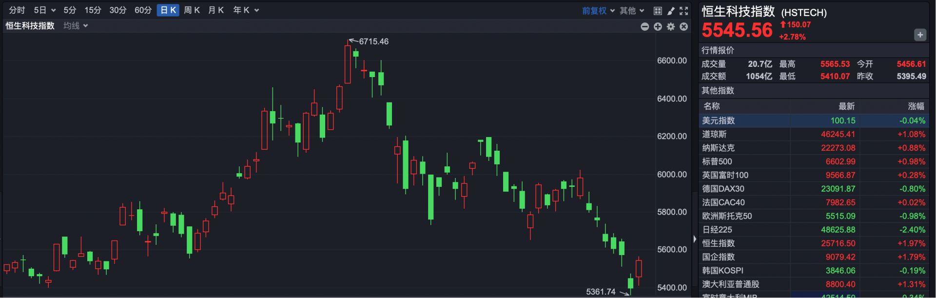 恒生科技指数报收于 5545.56 点,上涨 150.07 点,涨幅 2.78%。