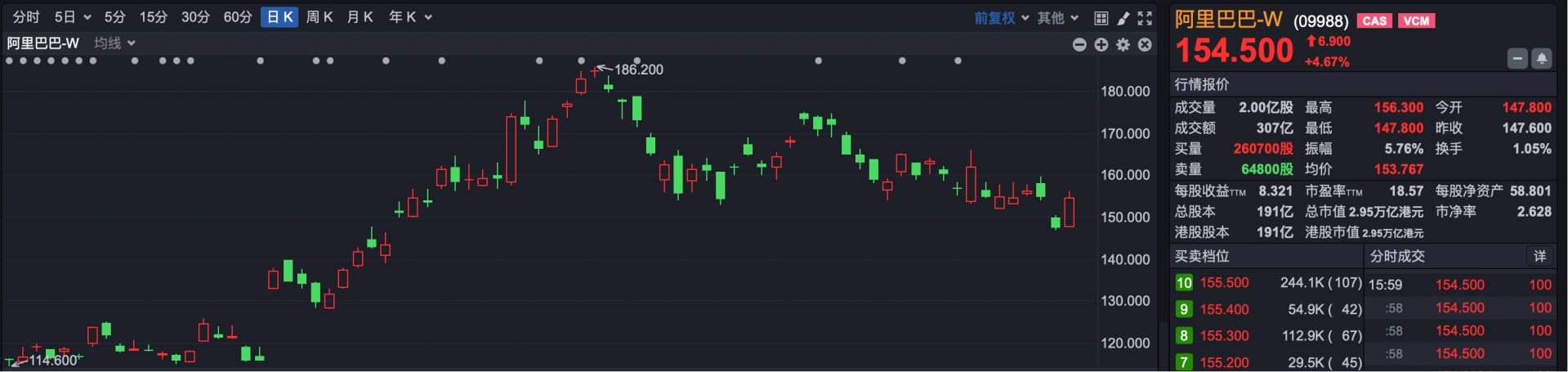 今天,港股市场的最大看点来自阿里巴巴-W(HK09988),在前期累计跌幅近 20% 之后,阿里今日最大涨幅一度接近 6%,最终收涨 4.67%。