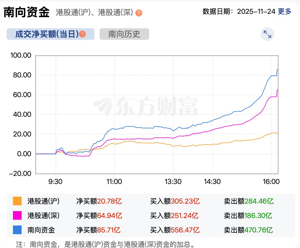 资金方面,截至收盘,南向资金累计净买入港股超 85 亿港元。