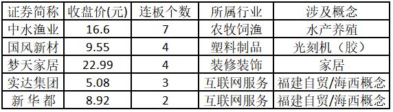 从连板情况来看,今日首板个股有 53 只;2 连板的个股有 8 只;3 连板及以上的个股有 4 只。今日连板数排名前 5 的个股包括中水渔业、国风新材、梦天家居、实达集团、新华都,具体如下表所示。