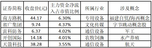 主力资金净流入金额占市值比例排名前 5 的个股分别为南方路机、省广集团、雷科防务、开创国际、天箭科技。