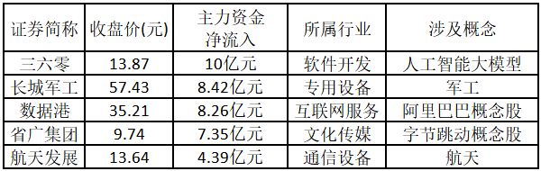 从主力资金来看,今日涨停板个股中,主力资金净流入金额排名前 5 的个股分别为三六零、长城军工、数据港、省广集团、航天发展。