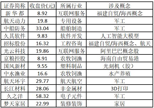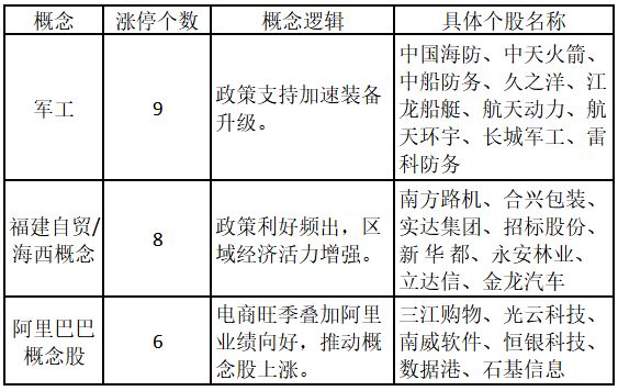 从概念特征来看,今日涨停板个股中,军工、福建自贸/海西概念、阿里巴巴概念的个股最多。