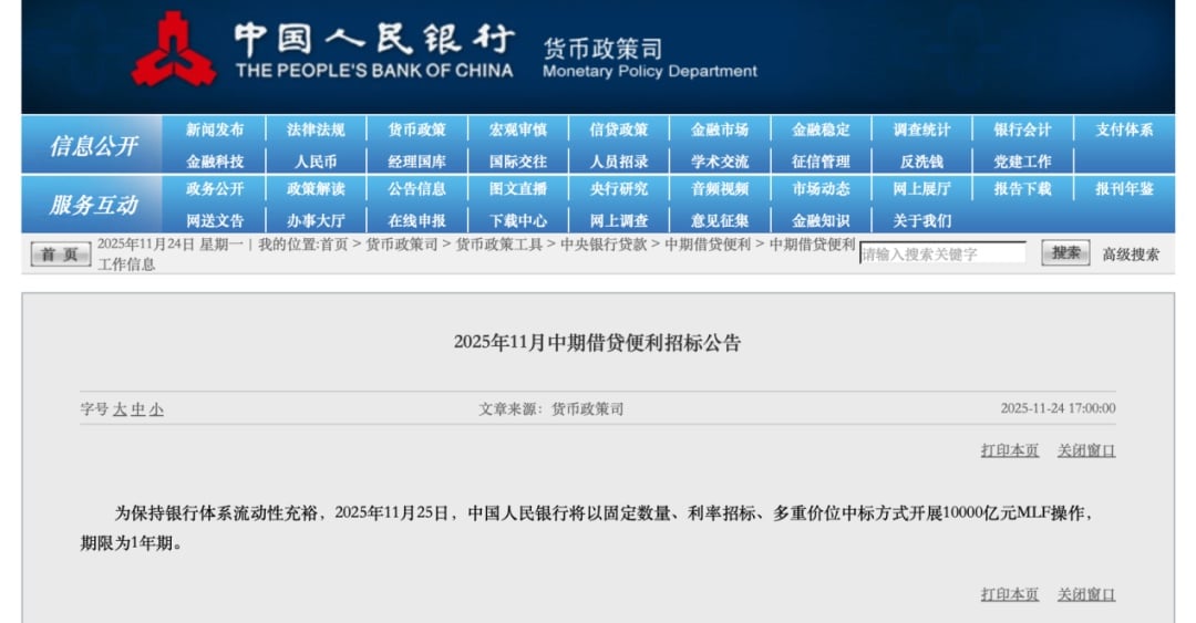 11 月 24 日,央行发布消息称,为保持银行体系流动性充裕,2025 年 11 月 25 日,中国人民银行将以固定数量、利率招标、多重价位中标方式开展 10000 亿元 MLF 操作,期限为 1 年期。