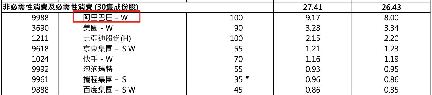 另外,消费行业的整体权重从 27.41% 下降到 26.43%。主要影响来自阿里巴巴,其权重从 9.17% 下降到 8%。