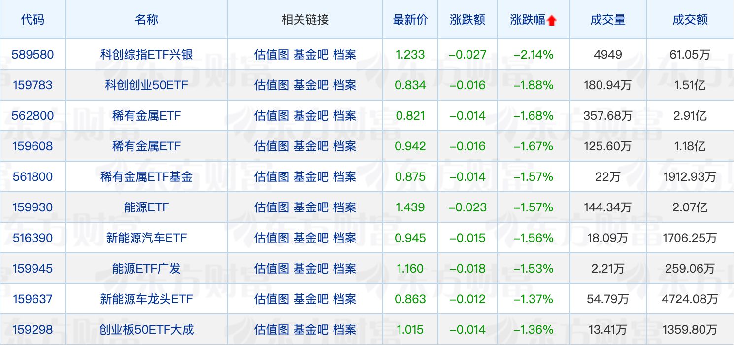下跌方面,科创综指 ETF 兴银领跌 2.14%,多只稀有金属 ETF 回调居前。