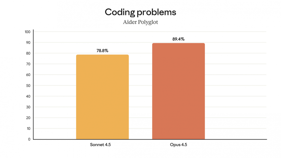 Opus 4.5 可以轻松解决具有挑战性的编码问题,在 Aider Polyglot 上比 Sonnet 4.5 高出 10.6 个百分点。
