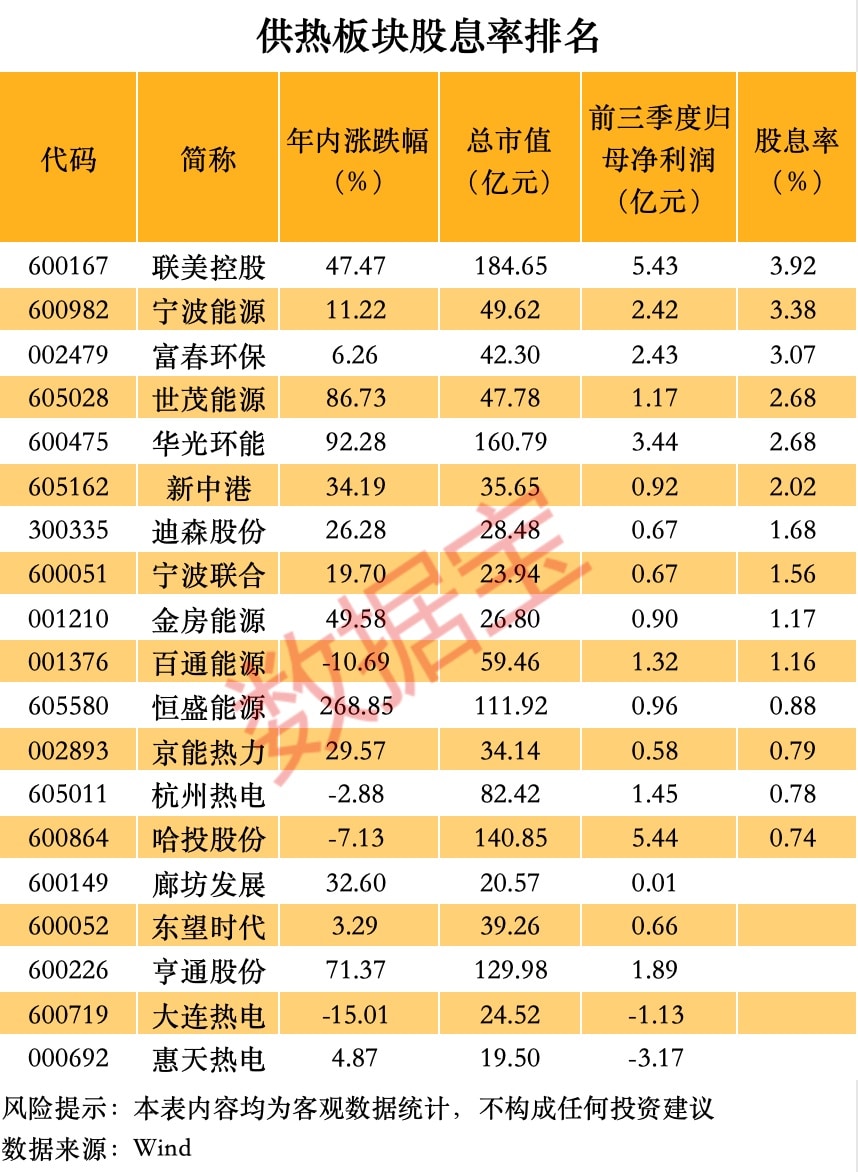 从业绩来看,前三季度供热板块业绩增长个股占比过半,哈投股份前三季度归母净利润 5.44 亿元,同比增长近 105% 居首。此外,金房能源、京能热力、惠天热电等个股前三季度归母净利润同比增长均超 30%。