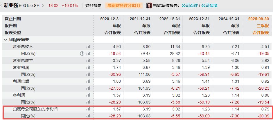 新亚强上市以来业绩波动较大。2022 年—2024 年,公司的归母净利润已经连续三个会计年度出现同比下滑。今年前三季度,新亚强营收同比下滑 19.05% 至 4.51 亿元,归母净利润同比下滑 20.39% 至 0.79 亿元。
