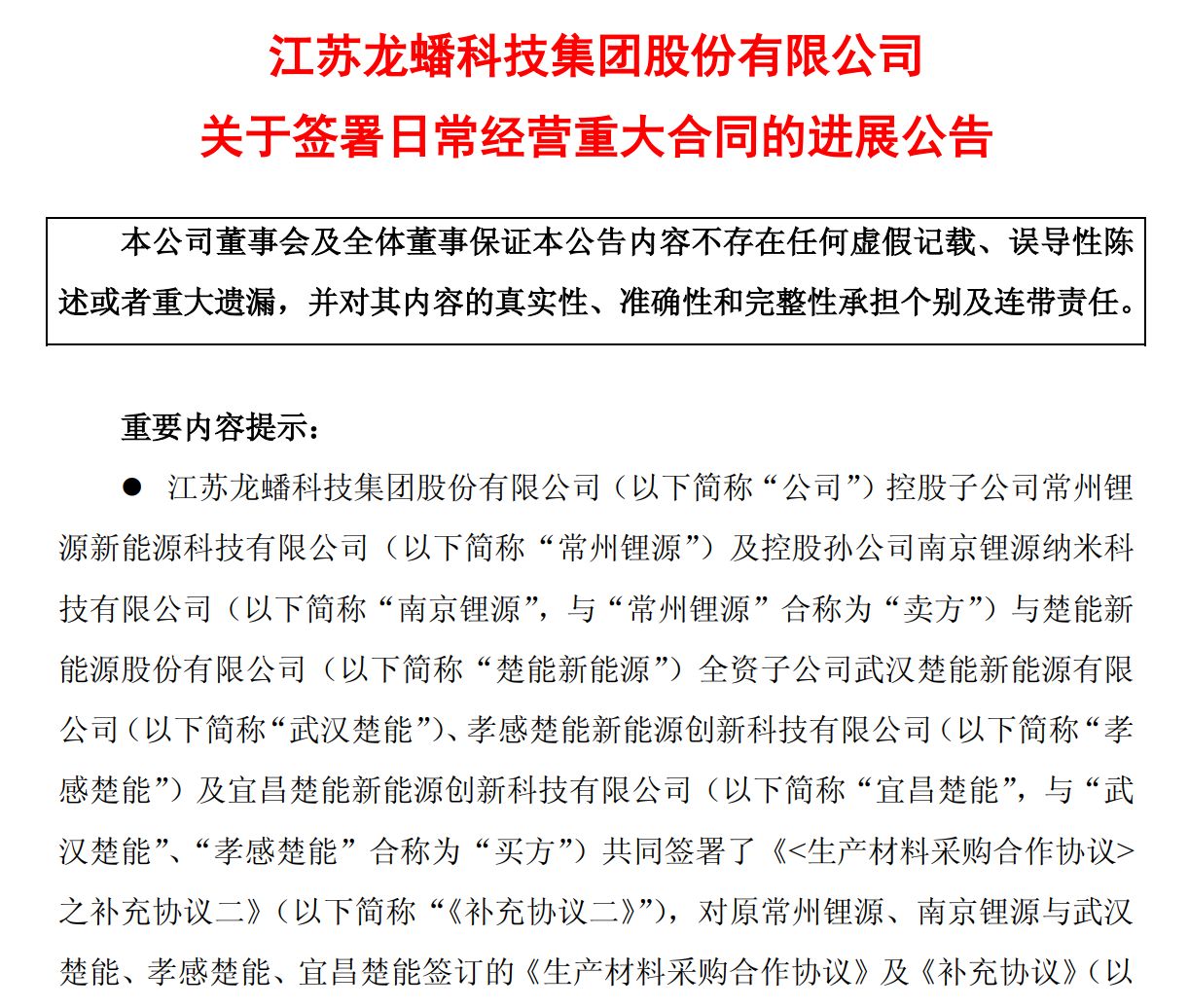 11 月 24 日晚间,龙蟠科技公告称,公司控股子公司常州锂源及控股孙公司南京锂源 (以下简称 「卖方」) 与楚能新能源全资子公司武汉楚能、孝感楚能及宜昌楚能 (以下简称为 「买方」) 共同签署了 《补充协议二》,对原协议相关条款进行补充与修订。