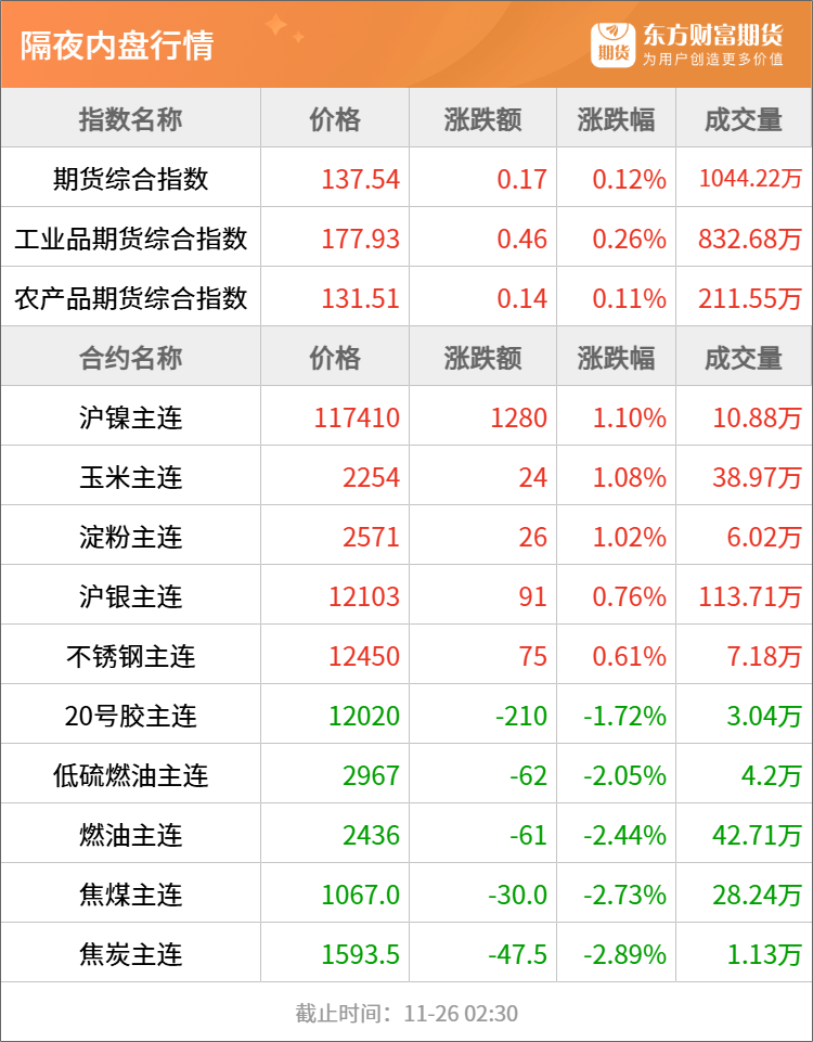生猪:据农业农村部监测,截至 11 月 25 日 14:00 时,全国农产品批发市场猪肉平均价格为 17.72 元/公斤,较前一日下降 1.1%;鸡蛋平均价格为 7.35 元/公斤,较前一日持平。(新华财经)