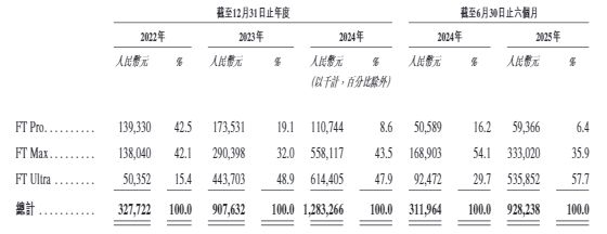2022 年、2023 年、2024 年和 2025 年上半年 (下称 「报告期内」),福瑞泰克的主要收入来源为 FT Max 解决方案,营收占比分别为 42.1%、32%、43.5% 和 35.9%。同期内,FT Pro 的营收占比从 42.5% 大幅下滑至 6.4%,而 FT Ultra 的营收占比从 15.4% 一路升至 57.7%。