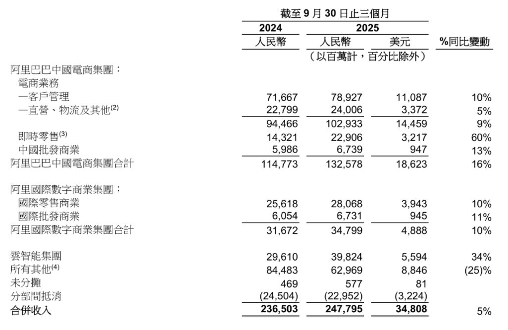 第二季度公司营收 2477.95 亿元,同比增长 5%,预估 2452 亿元;第二季度调整后每 ADS 收益 4.36 元,预估 6.34 元;第二季度中国电商事业集团收入 1325.8 亿元;调整后净利润 103.5 亿元,预估 168 亿元。(注:阿里巴巴的 2026 财年 Q2 是自然年的 2025 年 7 月 1 日至 9 月 30 日。阿里巴巴的 2026 年财年是从自然年 2025 年 4 月 1 日至 2026 年的 3 月 31 日。)