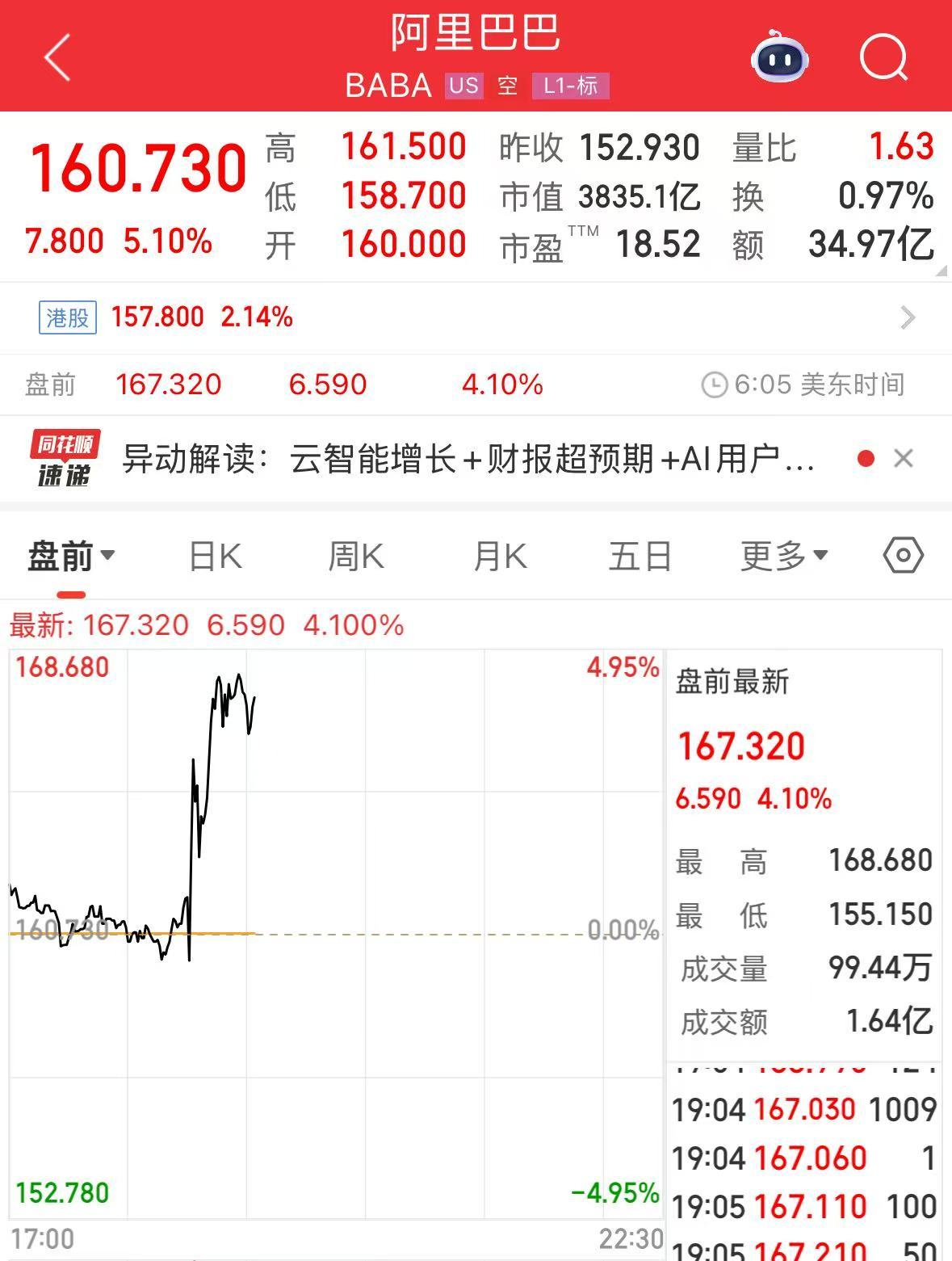市场方面,阿里巴巴美股盘前股价直线拉升,截至发稿前上涨 4.10%。