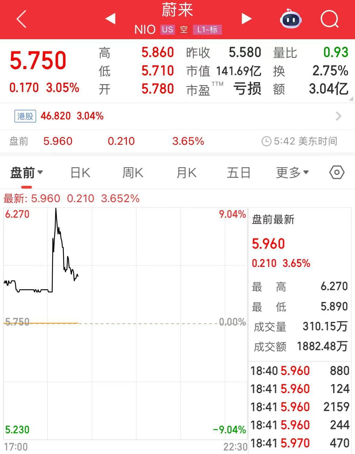 市场方面,蔚来美股一度涨超 9%,随后涨幅收窄,现涨 3.65%。