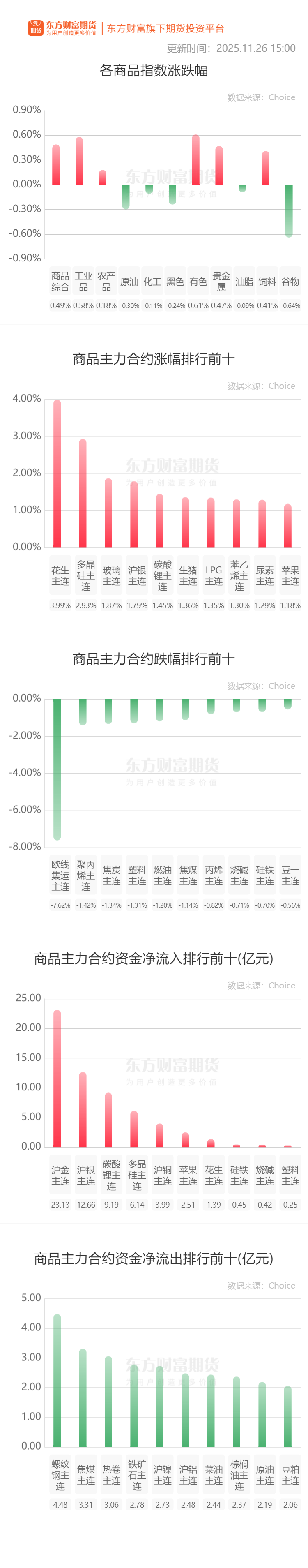 生猪:据农业农村部监测,截至 11 月 26 日 14:00 时,全国农产品批发市场猪肉平均价格为 17.87 元/公斤,较前一日上升 0.8%;鸡蛋平均价格为 7.27 元/公斤,较前一日下降 1.1%。(新华财经)