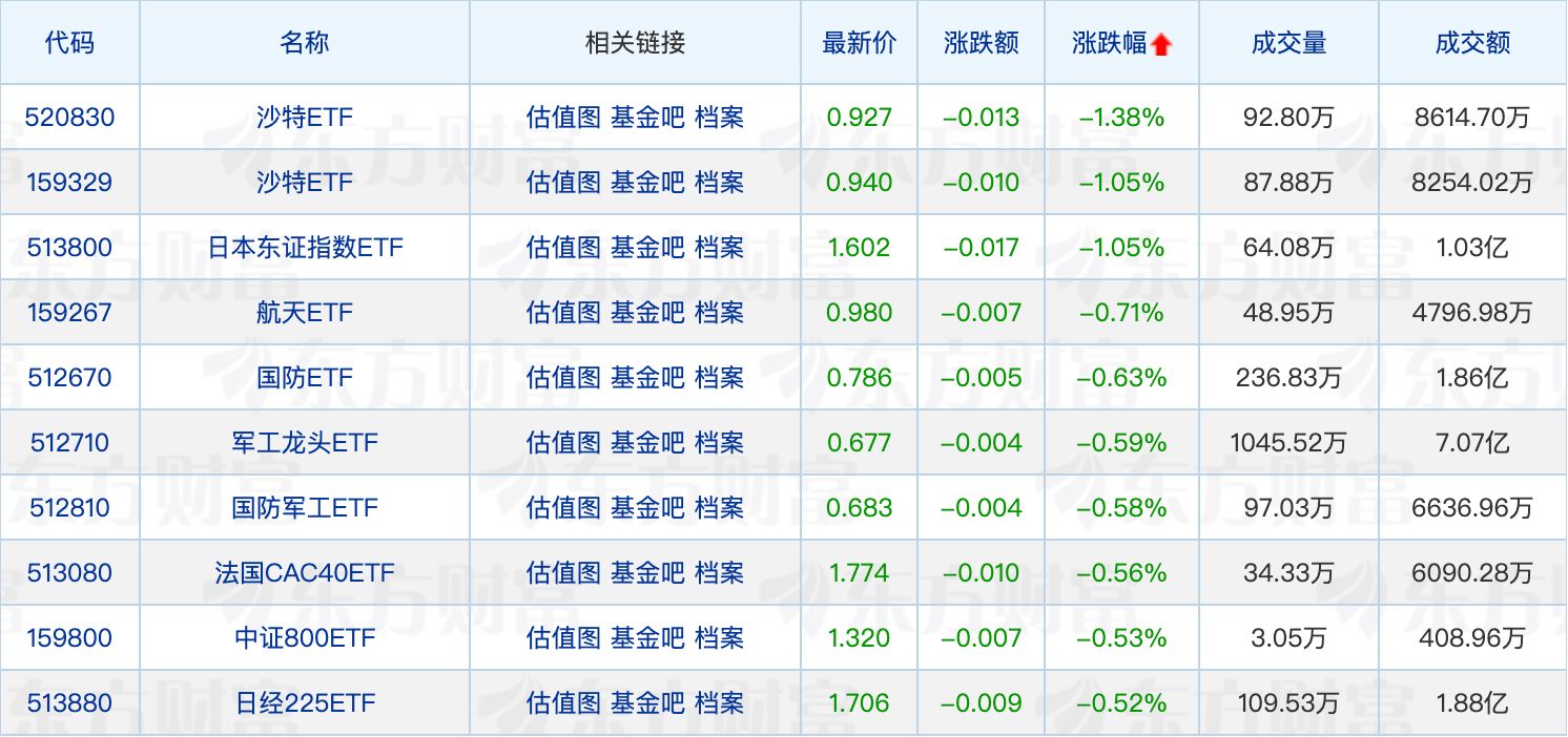 下跌方面,沙特 ETF 回调领跌,最大跌幅为 1.38%。此外,国防、军工相关 ETF 也回调居前。