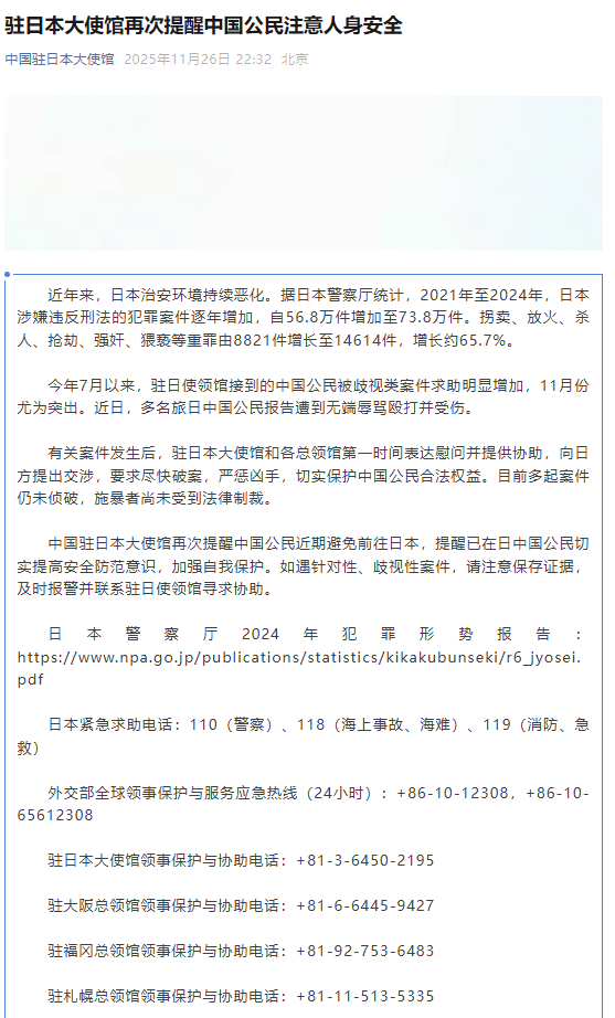 今年 7 月以来,驻日使领馆接到的中国公民被歧视类案件求助明显增加,11 月份尤为突出。近日,多名旅日中国公民报告遭到无端辱骂殴打并受伤。