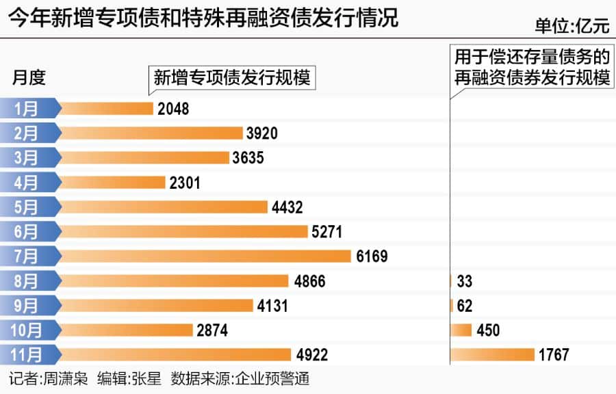 根据各地披露的发债信息,11 月地方新增专项债发行规模预计为 4922 亿元,较上月增长了超 2000 亿元。与此同时,11 月用于偿还存量债务的地方再融资债券 (又称特殊再融资债券) 发行规模为 1767 亿元,较上月增长了超 1300 亿元。