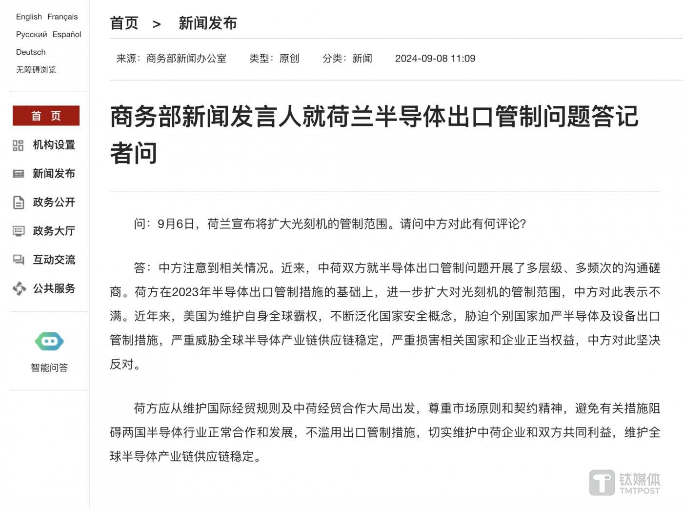 9 月 8 日,中国商务部新闻发言人就此表示,中方注意到相关情况。近来,中荷双方就半导体出口管制问题开展了多层级、多频次的沟通磋商。荷方在 2023 年半导体出口管制措施的基础上,进一步扩大对光刻机的管制范围,中方对此表示不满。近年来,美国为维护自身全球霸权,不断泛化国家安全概念,胁迫个别国家加严半导体及设备出口管制措施,严重威胁全球半导体产业链供应链稳定,严重损害相关国家和企业正当权益,中方对此坚决反对。荷方应从维护国际经贸规则及中荷经贸合作大局出发,尊重市场原则和契约精神,避免有关措施阻碍两国半导体行业正常合作和发展,不滥用出口管制措施,切实维护中荷企业和双方共同利益,维护全球半导体产业链供应链稳定。