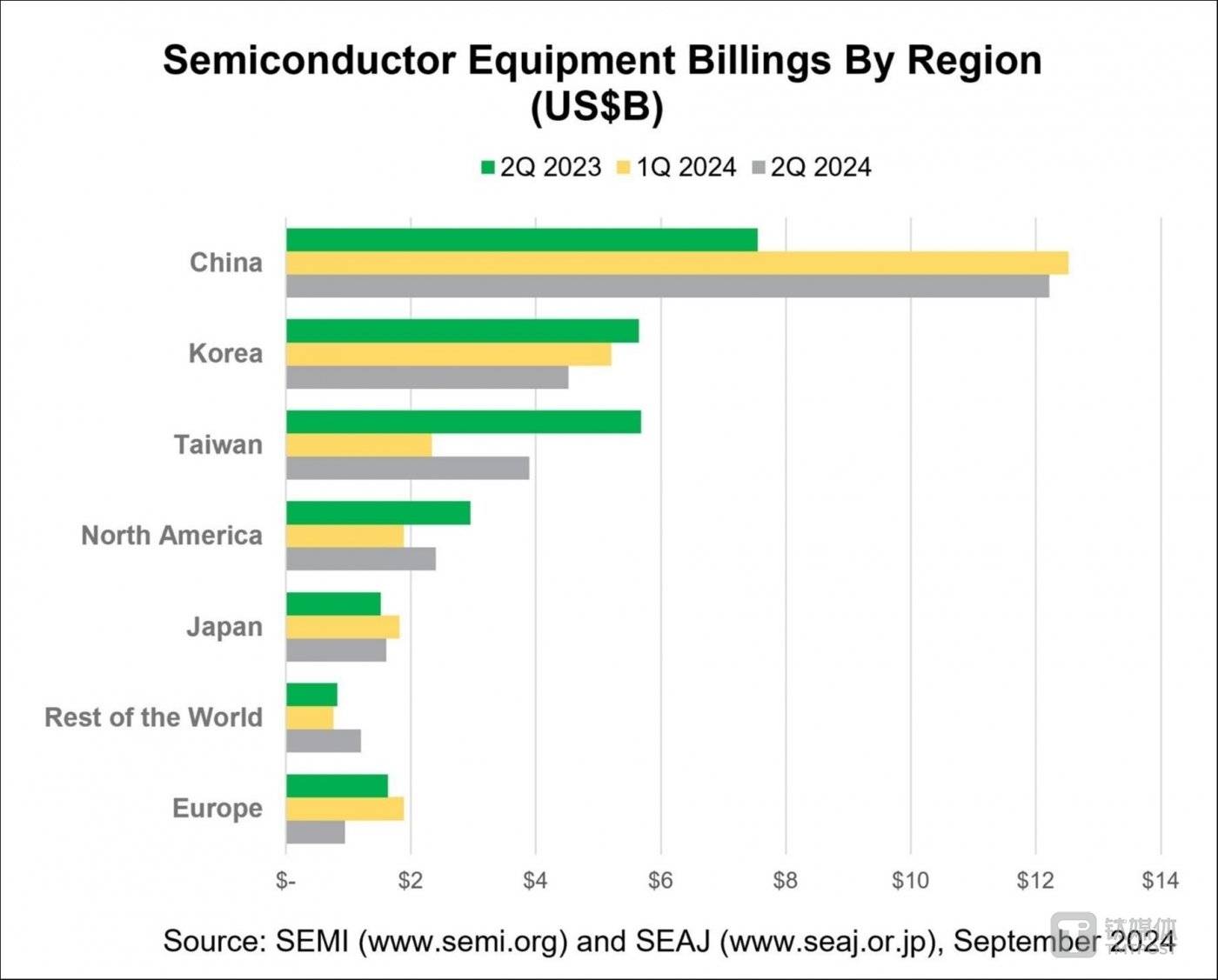 SEMI 报告还显示,2024 年第二季度,全球半导体设备出货金额同比增长 4%,达到 268 亿美元,同期环比微幅增长 1%。其中,中国大陆今年第二季度半导体设备出货金额 122.1 亿美元,同比大增 62%。