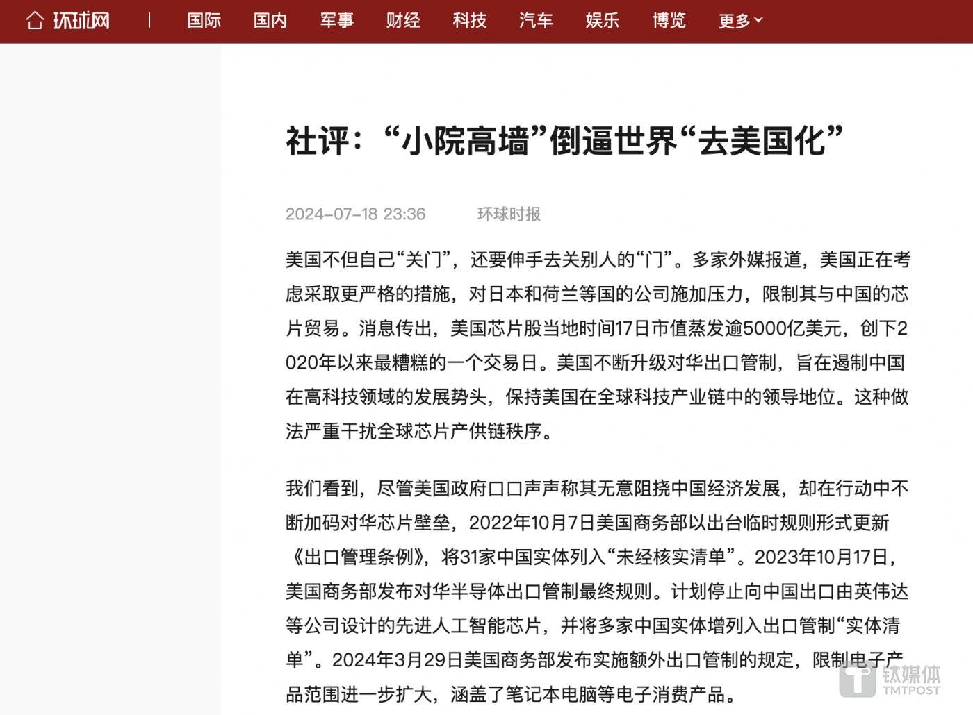 环球时报在此前社评 『「小院高墙』 倒逼世界 『去美国化』」 文章中指出,美国不断升级对华出口管制,旨在遏制中国在高科技领域的发展势头,保持美国在全球科技产业链中的领导地位。这种做法严重干扰全球芯片产供链秩序。美国通过所谓 「芯片外交」,与盟友建立紧密的半导体供应链合作,试图构建一个排除中国的高科技产业领域国际联盟。然而,全球芯片产业链深度绑定,想人为创造一个没有中国的世界,只是一种政治狂想。美国要求盟友国家收紧对中国芯片制造设备的维护服务,这对包括 ASML、东京电子等在内的关键设备供应商以及英特尔、高通、英伟达等美国芯片企业产生了直接影响。芯片产业是全球高科技产业链中的关键环节,其稳定性直接关系到电子产品的生产和创新。美国对中国的遏制打压,伤害的是全球,更是会伤害它自己。