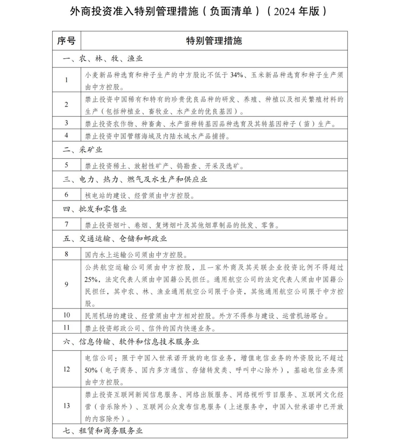 【金桂财经综合】 经党中央、国务院同意,国家发展改革委、商务部于 2024 年 9 月 8 日发布第 23 号令,全文发布 《外商投资准入特别管理措施 (负面清单)(2024 年版)》,自 2024 年 11 月 1 日起施行。《外商投资准入特别管理措施 (负面清单)(2021 年版)》 同时废止。