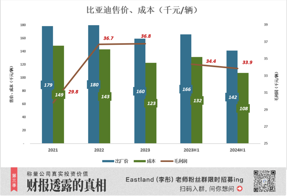2024 年 H1,比亚迪陆续推出多款 「亲民车型」,现有车型则 「应降尽降」。上半年销售均价 14.2 万元,同比下降 2.5 万元。由于单车成本也降了 2.4 万元,结果每辆车仅仅少赚 490 元!