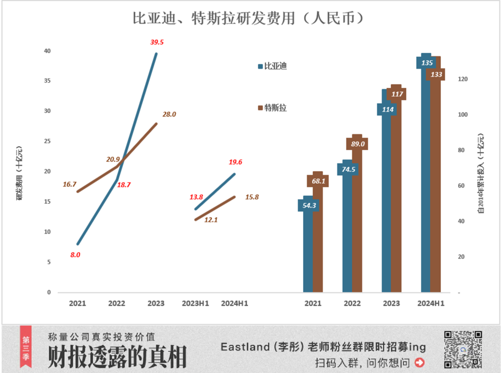 自 2014 年 (含) 到 2023 年,比亚迪、特斯拉累计研发投入分别为 1144 亿、1170 亿;到 2024 年 6 月末,比亚迪累计研发投入达 1346 亿 (自 2014 年起)。