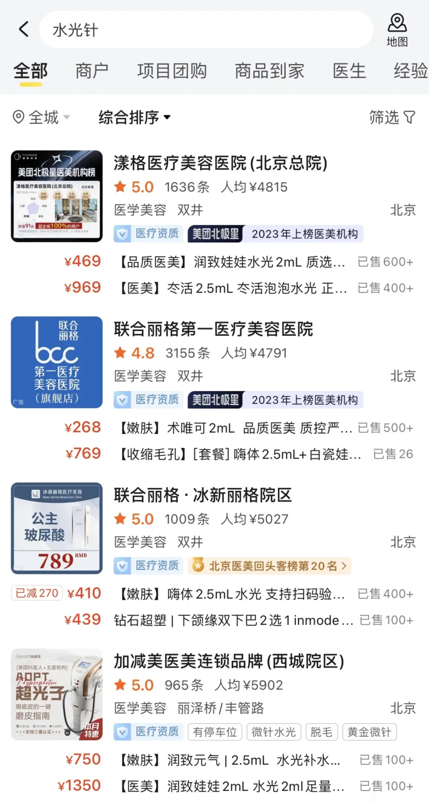 在淘宝上,具有快速提亮功效的 「嗨体水光针」 仅售 299 元。打开美团搜索北京的医美服务发现,以水光针为例,200 至 1000 元是主流价格带。