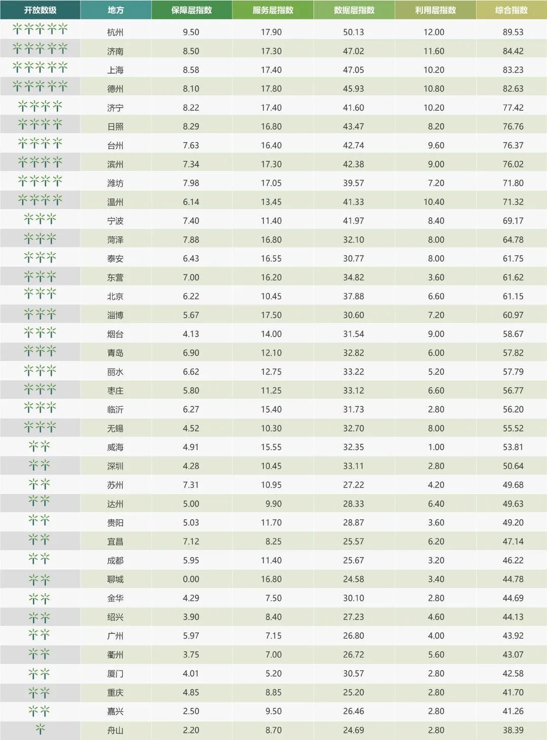 2025 年度全国城市开放数林指数中,杭州、济南、上海与德州综合表现最优,进入第一等级 「五棵数」,获得 「数开繁盛」 大奖。 济宁、日照、台州、滨州、潍坊与温州也表现优异,进入第二等级 「四棵数」。 其次是宁波、菏泽、泰安、东营、北京、淄博、烟台、青岛、丽水、枣庄、临沂与无锡,进入第三等级 「三棵数」。杭州在保障层、服务层、数据层与利用层四个维度上均表现最优。宜昌与菏泽进步显著,获得 「数飞猛进」 奖。