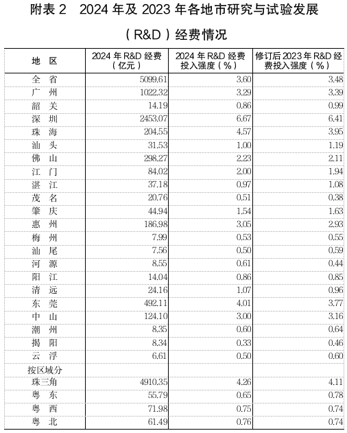 11 月 25 日,广东省统计局、广东省科学技术厅、广东省财政厅最新发布的 《2024 年广东省科技经费投入统计公报》 显示,2024 年,广东全省共投入研究与试验发展 (R&D) 经费 5099.61 亿元,比上年增加 296.99 亿元,增长 6.2%;研究与试验发展 (R&D) 经费投入强度为 3.60%,比上年提高 0.12 个百分点。按研究与试验发展 (R&D) 人员全时工作量计算的人均经费为 43.10 万元,比上年增加 3.16 万元。