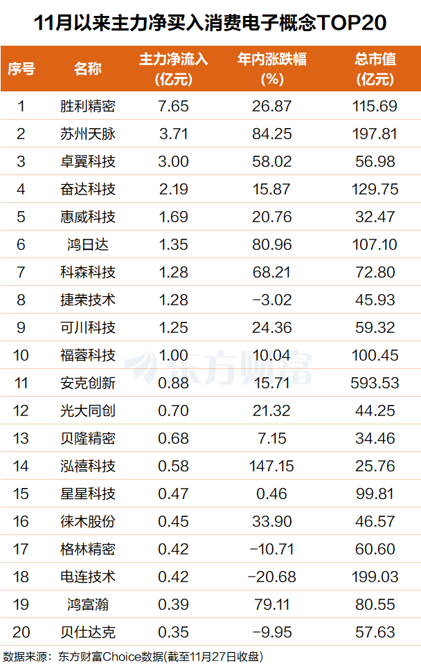 东方财富Choice 数据显示,自 11 月以来,主力资金抢筹多只消费电子概念股,其中胜利精密排名第一,主力净买入 7.7 亿元;苏州天脉排名第二,主力净买入 3.7 亿元。