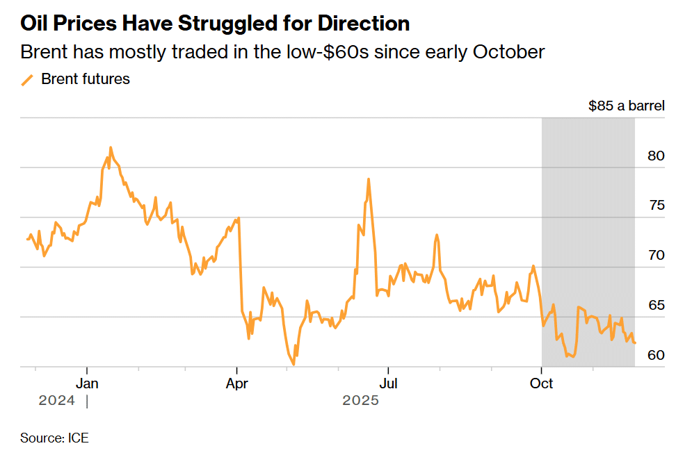 布伦特原油期货目前的交易价格仍高于美国宣布制裁俄罗斯两大石油生产商——俄罗斯石油公司 (Rosneft PJSC) 和卢克石油公司 (Lukoil PJSC) 之前的水平,略高于每桶 60 美元。自 10 月初以来,油价也一直维持在相对狭窄的区间内波动。