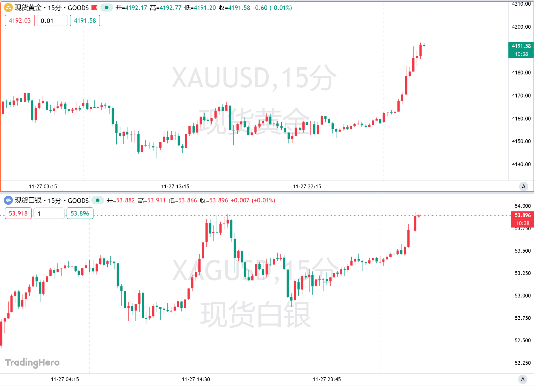 周五亚盘,受美联储 12 月降息预期提振,国际现货黄金走高,一度向上触及 4190 美元/盎司。现货白银日内涨超 1%,逼近 54 美元/盎司。美国市场因感恩节休市,假期交投清淡通常会放大短期价格波动。