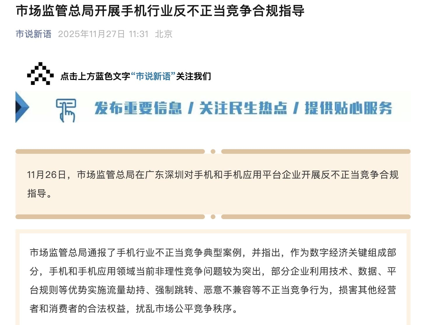 11 月 27 日,据国家市场监督管理总局信息公开平台 「市说新语」 消息,日前,市场监管总局在广东深圳对手机和手机应用平台企业开展反不正当竞争合规指导。