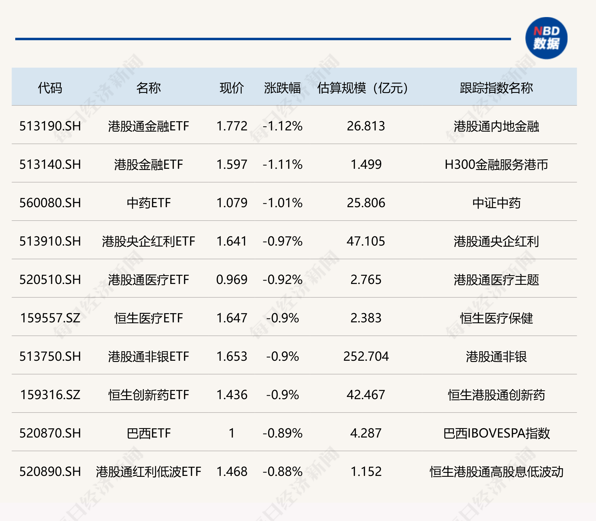 下跌方面,港股通金融、中药等 ETF 跌超 1%。