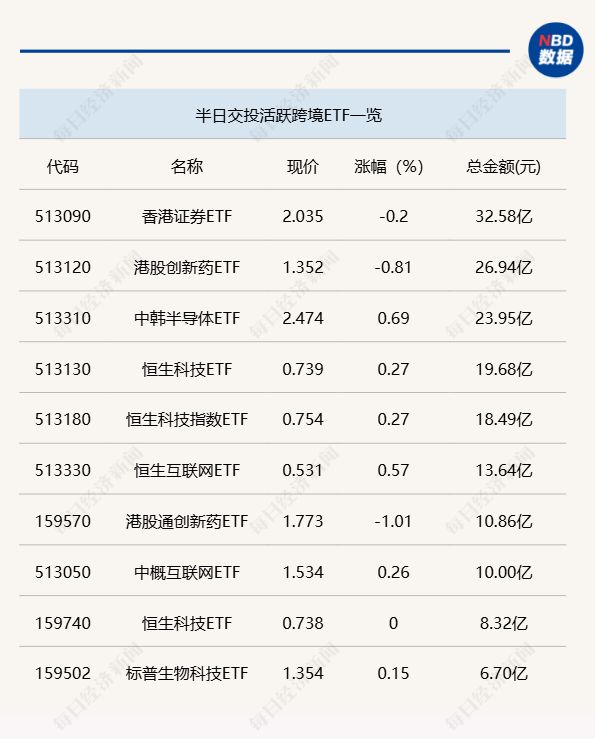 11 月 28 日上午,半导体与证券相关 ETF 交投相对活跃,其中,科创芯片 ETF(588200) 半日成交金额为 15.65 亿元,证券 ETF(512880) 半日成交金额为 11.39 亿元。跨境 ETF 方面,港股市场相关 ETF 交投缩量显著,无一只 ETF 半日成交金额达 35 亿元。