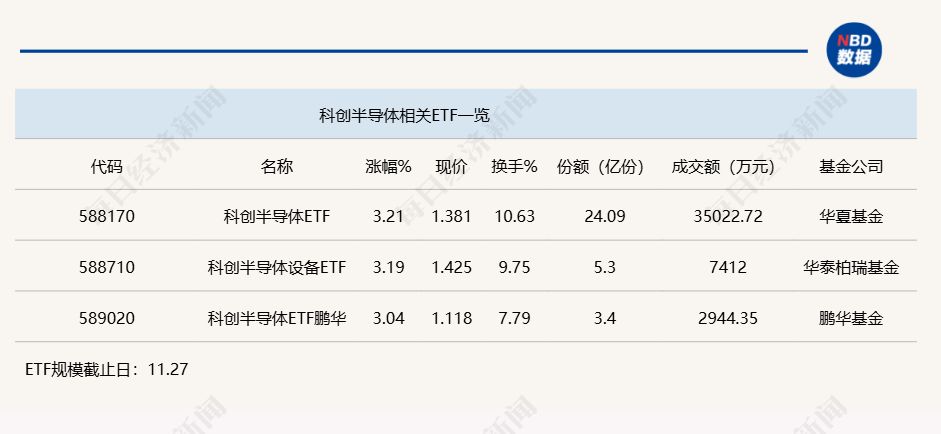 点评:科创半导体设备 ETF(588710)、科创半导体 ETF 鹏华 (589020) 以及科创半导体 ETF(588170) 今日上午涨幅均超过 3%,其中,科创半导体 ETF(588170) 份额较大,达到 24.09 亿份,其半日成交金额为 3.5 亿元。上述三只 ETF 均追踪的是上证科创板半导体材料设备主题指数。