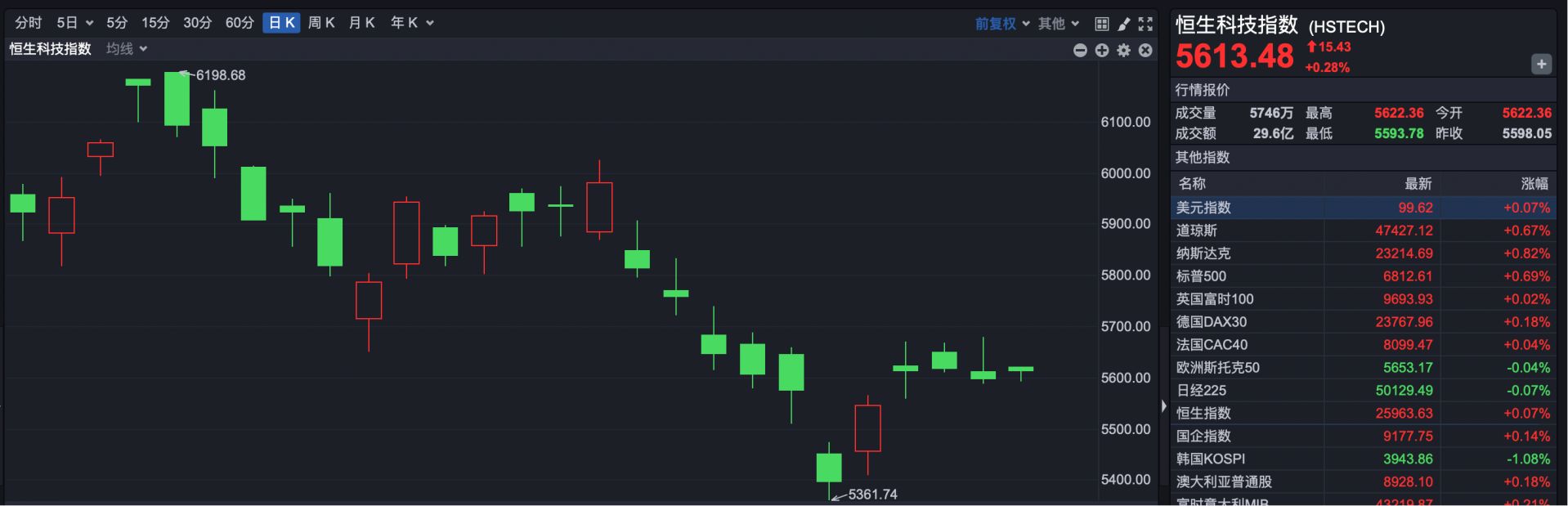 恒生科技指数报 5613 点,涨幅 0.29%。