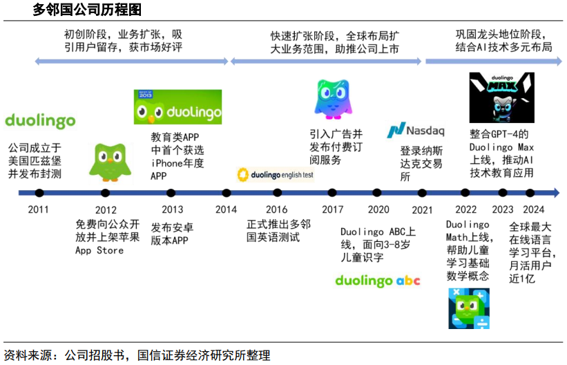 国信证券研报显示,多邻国是由 「验证码之父」LuisvonAhn 及其博士生 SeverinHacker 于 2011 年联合创立的教育科技公司。2021 年 7 月末,公司在美股上市,最新总市值为 87.11 亿美元 (约 617 亿元人民币)。