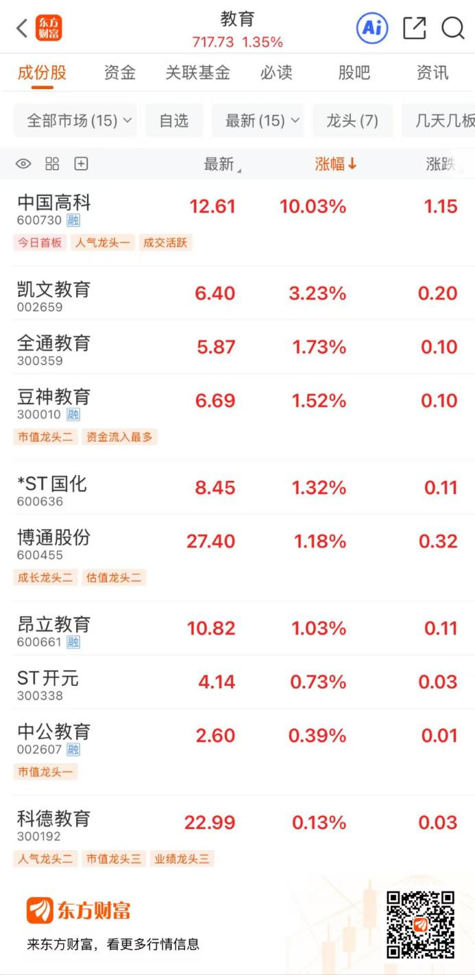 11 月 28 日,A 股 「AI+」 的风吹到了教育。截至早间收盘,教育板块上涨 1.35%,涨幅在两市行业板块中位居前列。个股方面,中国高科涨停,凯文教育涨超 3%,全通教育、豆神教育、*ST 国化、博通股份、昂立教育等多股涨超 1%。