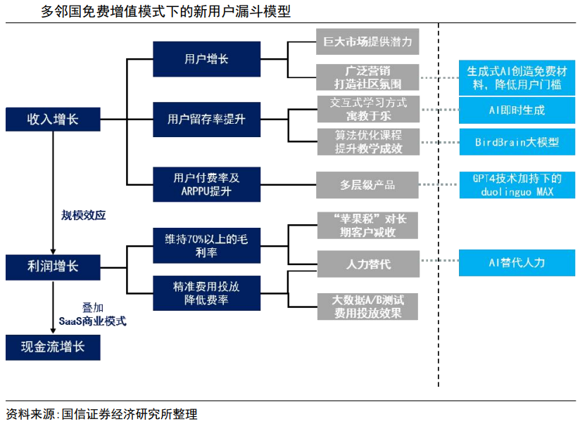 2021 年,公司与 OpenAI 合作,利用生成式 AI-GPT-3 模型生成大量不同例句及测试题。2024 年初,多邻国进一步加大 AI 的应用力度,减少负责翻译和内容创作的合同工,提高生成式 AI 在这些领域的比重,同时将剩余合同工的工作重心转向监督和把控 AI 产出的质量。