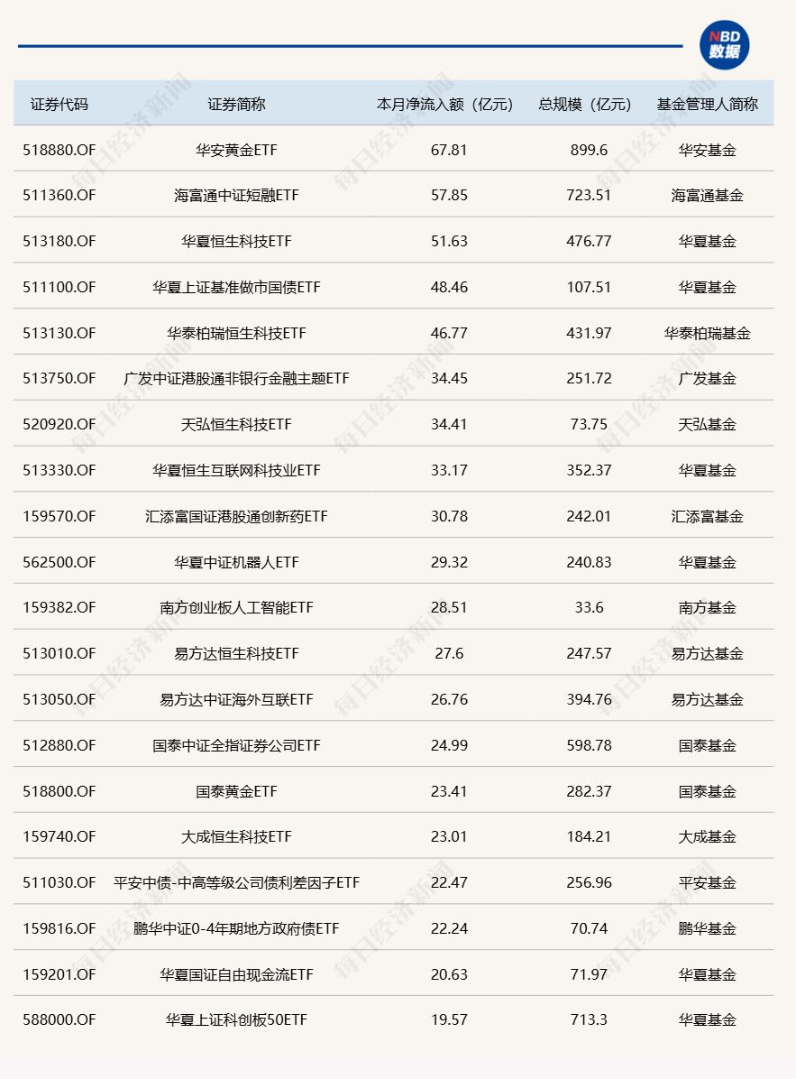 Wind 数据显示,在 11 月 27 日的非货币 ETF 市场中,华夏上证 50ETF 基金份额增加 2.12 亿份,对应资金净流入 6.60 亿元;华夏中证 A500ETF 基金份额增加 5.10 亿份,实现净流入 5.84 亿元;华夏上证基准做市国债 ETF 份额增加 0.05 亿份,带来净流入 5.68 亿元。
