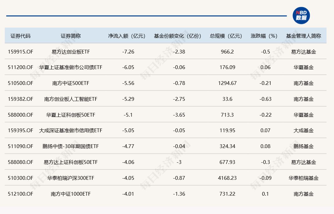 与此同时,易方达创业板 ETF 基金份额减少 2.38 亿份,对应资金净流出 7.26 亿元;华夏上证基准做市公司债 ETF 份额减少 0.06 亿份,出现净流出 6.05 亿元;南方中证 500ETF 份额减少 0.78 亿份,录得净流出 5.56 亿元。
