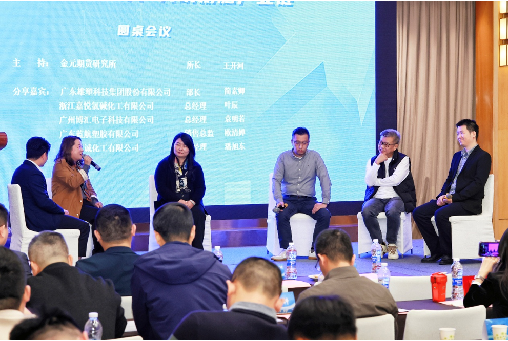 在圆桌讨论环节,金元期货研究所所长王开河、广州博汇电子科技有限公司总经理袁明若、广东蓝航塑胶有限公司销售总监欧淸婵、广州汇诚化工有限公司总经理潘旭东、广东雄塑科技集团股份有限公司部长简素卿、浙江嘉悦氯碱化工有限公司总经理叶辰等嘉宾围绕当前市场低迷的原因以及下游生产型企业的转型方案,行业高供应、高库存与弱需求的博弈中应如何破局,以及当前如何驱动库存去化问题、企业通过期现结合优化采购、销售定价以及基差贸易、含权贸易等议题展开讨论。