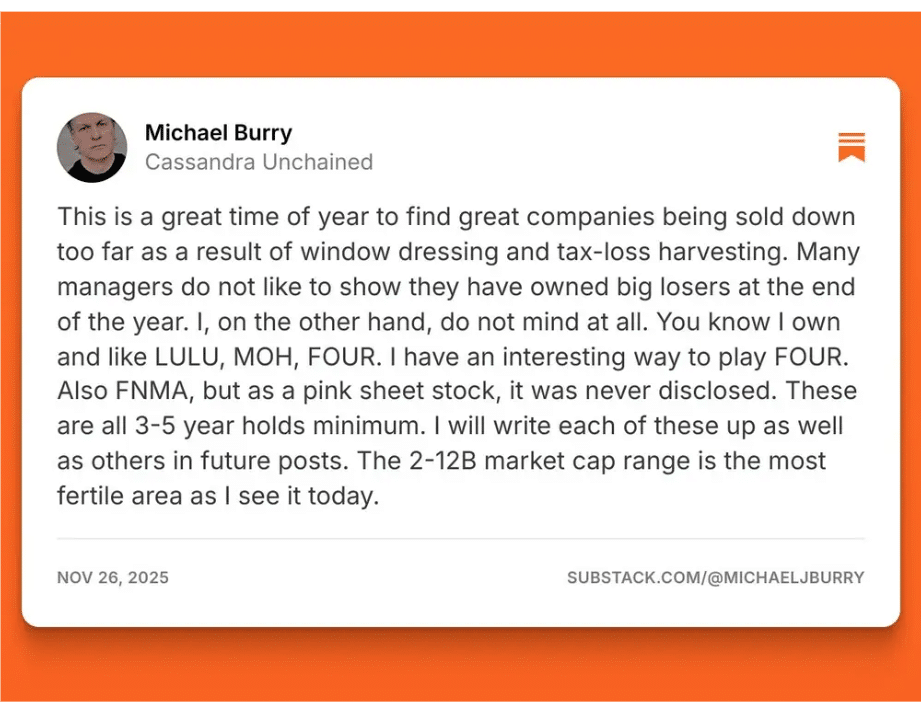 伯里还表示,现在是 「一年中寻找被过度抛售的优秀公司的绝佳时机,这些抛售源于基金经理粉饰业绩和投资者的税收损失收割」。他解释说,「许多基金经理不喜欢在年底展示他们持有大幅亏损的股票」,但他并未受此困扰。
