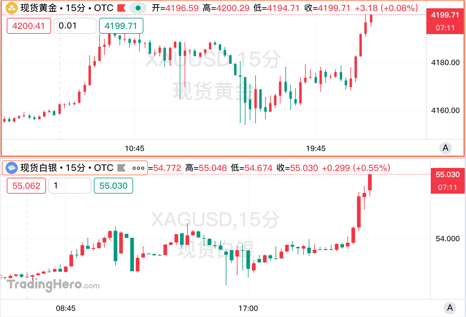 现货白银突破 10 月 17 日创下的高点,将历史纪录刷新至 55.05 美元/盎司,日内涨逾 3%。现货黄金持续拉升,触及 4200 美元/盎司,为 11 月 14 日以来首次,日内涨超 1%。